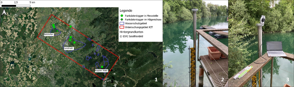 Im Wasserschutzgebiet Balzhofen befindet sich der grundwassergespeiste Hägenichsee, der ebenfalls mit einem Funkdatenlogger ausgestattet wurde (Abb. 2 und 3). Hierdurch verfügt das Untersuchungsgebiet über ein Grundwasserüberwachungssystem, das autark die gemessenen Daten sendet und sehr wenig gewartet werden muss. Es existieren nicht über alle drei Wasserschutzgebiet verteilt Grundwassermessstellen, sondern gehäuft in bestimmten Regionen, sodass ein Messnetz verteilt über die gesamte Fläche zurzeit nicht aufgebaut werden kann.